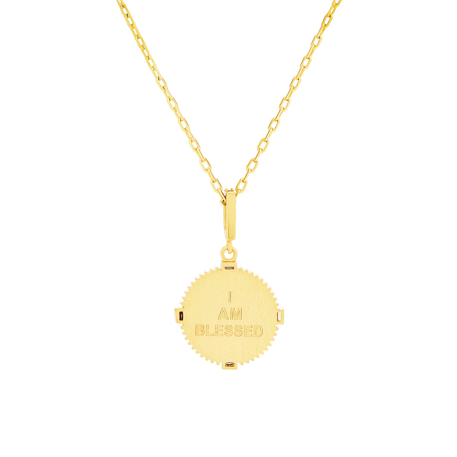 The amethyst pendant of our 'I Am Blessed' necklace is designed to relieve your daily stresses as it hangs delicately around your neck.The gold angel wing detail will glisten in the light as you feel thankful for those closest to you, and the engraving on the back of the pendant acts as a daily reminder of how blessed you are. Manifest your dreams with the 'I Am Blessed' necklace, perfectly layered with the 'I Am Loved' necklace for a beautiful Celeste Starre finish.